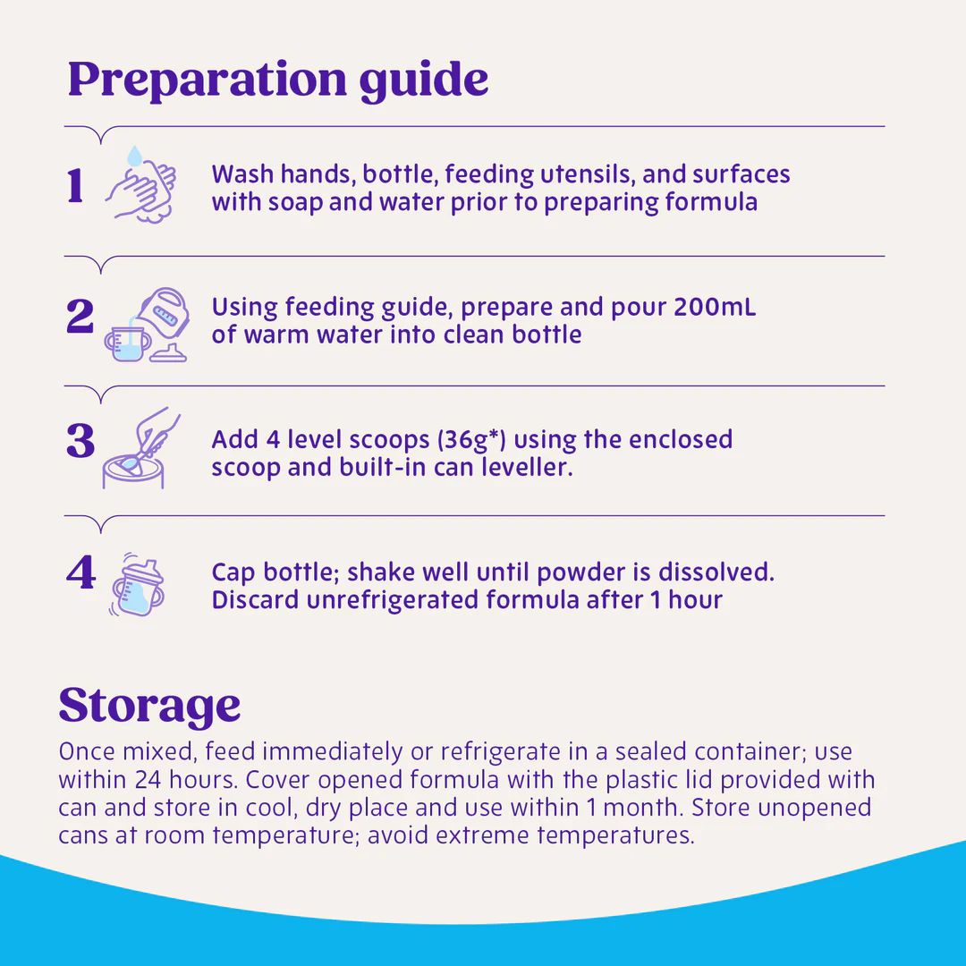 For best results, always follow the preparation instructions on the packaging exactly. Prepare bottles and teats as directed, and do not change the proportions of powder except on medical advice. Incorrect preparation can make your baby very ill. Use only the enclosed scoop. Add one level scoop of powder to each 50mL of cooled, boiled drinking water. Infants over 12 months should be offered solid food in addition to this product.