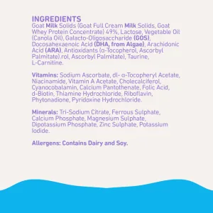 Goat Milk Solids (Goat Full Cream Milk Solids, Goat Whey Protein Concentrate) 49%, Lactose, Vegetable Oil (Canola Oil), Galacto-Oligosaccharide (GOS), Docosahexaenoic Acid (DHA, from Algae), Arachidonic Acid (ARA), Antioxidants (α-Tocopherol, Ascorbyl Palmitate). Vitamins: Sodium Ascorbate, dl-alpha-Tocopheryl Acetate, Niacinamide, Cholecalciferol, Retinyl Acetate, Folic acid, Cyanocobalamin, Thiamine Hydrochloride, Riboflavin, Pyridoxine Hydrochloride. Minerals: Tri-Sodium Citrate, Ferrous Sulphate, Calcium Phosphate, Magnesium Sulphate, Dipotassium Phosphate, Zinc Sulphate, Potassium Iodide.